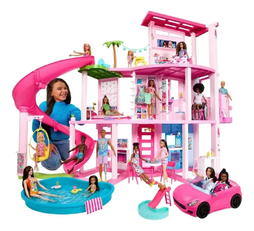 La Dreamhouse más divertida: 3 pisos, tobogán, piscina y más de 75 accesorios para horas de juego imaginativo.